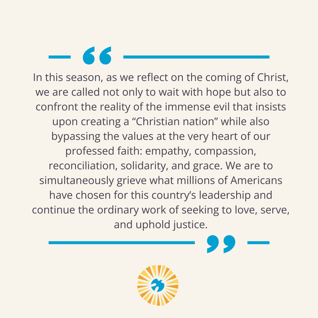 In this season, as we reflect on the coming of Christ, we are called not only to wait with hope but also to confront the reality of the immense evil that insists upon creating a “Christian nation” while also bypassing the values at the very heart of our professed faith: empathy, compassion, reconciliation, solidarity, and grace. We are to simultaneously grieve what millions of Americans have chosen for this country’s leadership and continue the ordinary work of seeking to love, serve, and uphold justice.