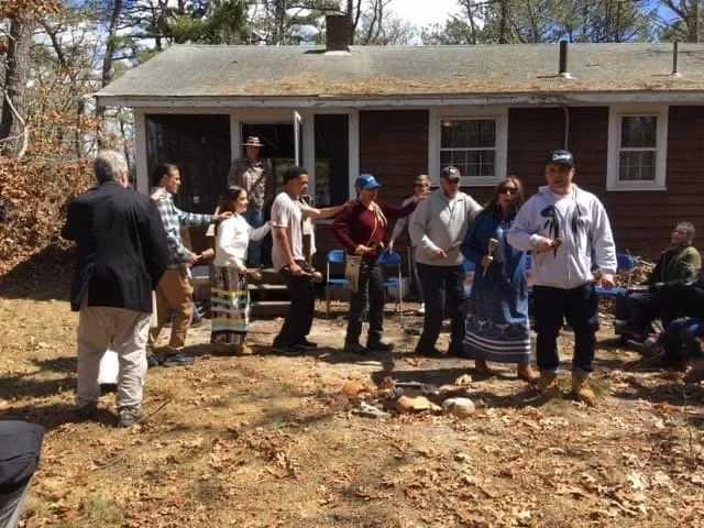 Members of a Wampanoag dance group perform a ritual outside Craig's Cape Cod cottage to celebrate the deed transfer.